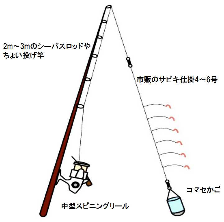 これとサビキ仕掛けとコマセカゴがあればシーバスロッドやちょい投げの竿があればOK